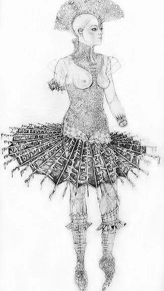 Durkan states that she designs and crafts “with the female body in mind, ” and what she could envision herself wearing. She oversees the entire design and craft process which often begins with a life size illustration of her design, forging metal pieces, incorporating fitting and sizing for the models who will wear her creations. These drawings drive the forging process, as she continually returns to them to amend or enhance throughout the process, incorporating fitting and sizing for the models who will wear her creations: all until she feels she has the desired outcome.